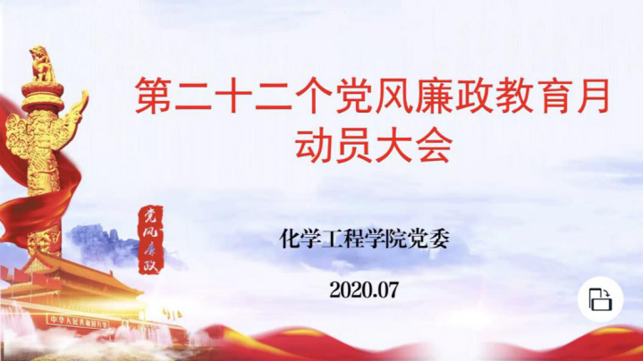 第二十二个党风廉政教育月活动方案》精神,化学工程学院实际,制定学院方案,于7月1日18:30,通过钉钉视频会议,召开学院第二十二个党风廉政教育月动员大会。全体教职工参加会议,党委书记马志强主持会议。