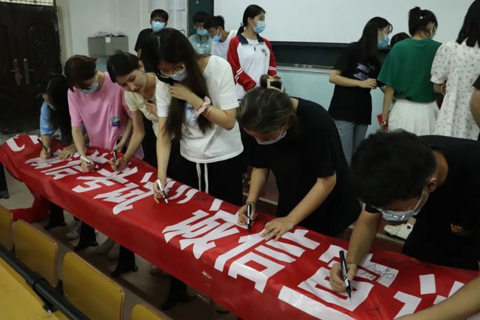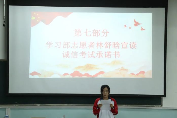 学习部志愿者林舒晗同学宣读诚信考试承诺书,让我们一起严格遵守考场的规章制度,营造良好的考试氛围,考出最真实的成绩!