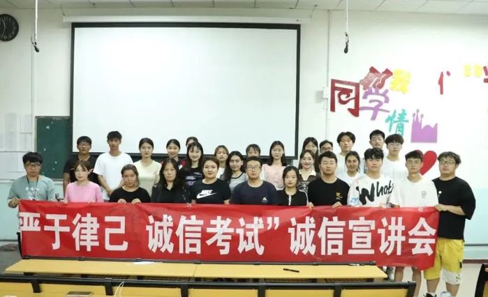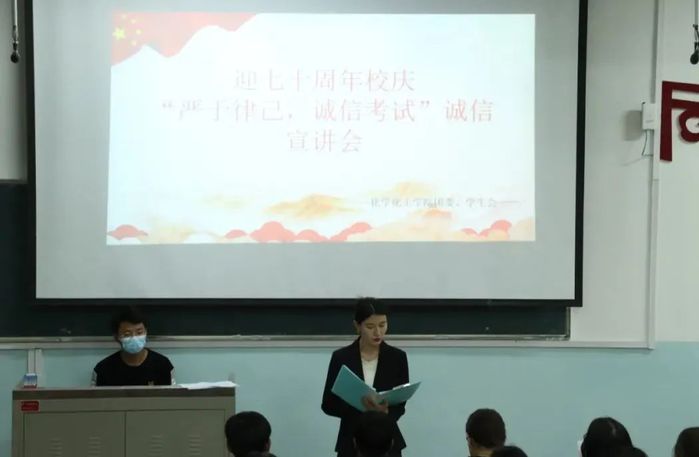 诚实是力量的一种象征,它显示着一个人的高度自重和内心的安全感与尊严感。临近期末,各科考试开始陆续进行。为了让同学们铭记考场规则,端正考试态度,以自己最真实的水平去完成考试,真正树立优良的学风和校风,2022年6月 6日 ,情色自拍 在7102教室开展喜迎70周年校庆系列活动之“严于律己,诚信考试”诚信考试宣讲会。