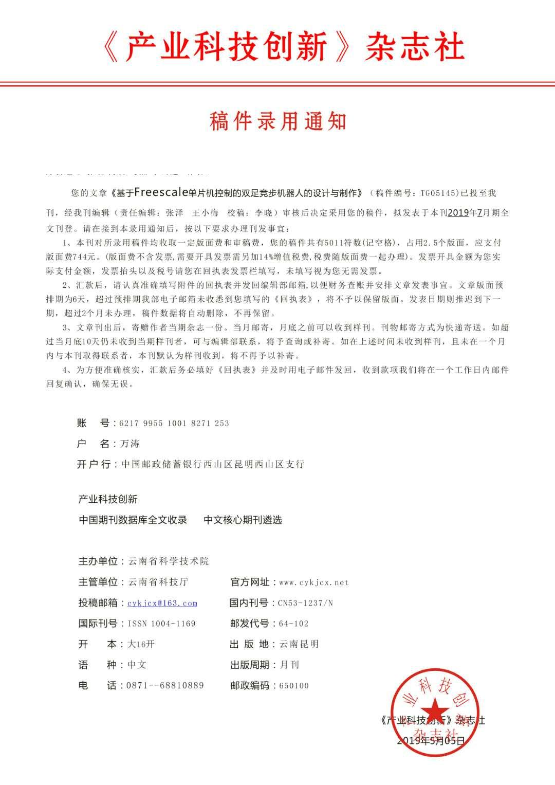 (5)撰写并发表论文一篇《基于Freescale单片机控制的双足竞步机器人的设计与制作》。