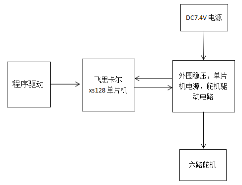 利用飞思卡尔芯片实现了对六个舵机的分时控制编写 VC上位机软件通过串口通信对双足竞步机器人进行调试通过人体仿生学调试出机器人的步态规划实现了具体操作是在相关电脑上装入CodewarrIDE驱动,打开该软件,根据舵机的角度,输入走路所转过的角度后,将机器人断开电脑,接入7.4V直流电源。观察每个舵机是否能够按照代码设定的角度进行转动,控制结构如图4-4。