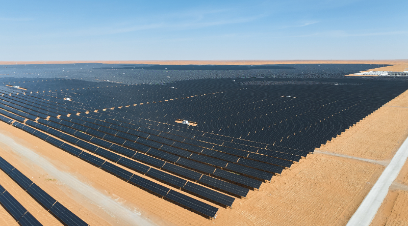 沙漠深处,一块块蓝色光伏板如波浪般向天际延伸,它们静静地吸收着炙热的阳光,将不毛之地变成巨大的“绿色电站”。
