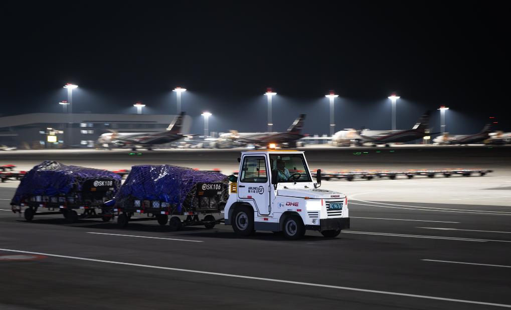 子夜时分,记者驱车来到这座机场时,扑面而来的是一派“不夜空港”的繁忙景象:雪亮的停机坪上,货机刚一停稳,工作人员便操控牵引车、加油车、转运车簇拥而上,卸货、加油、检查,井井有条,一刻也不耽误。