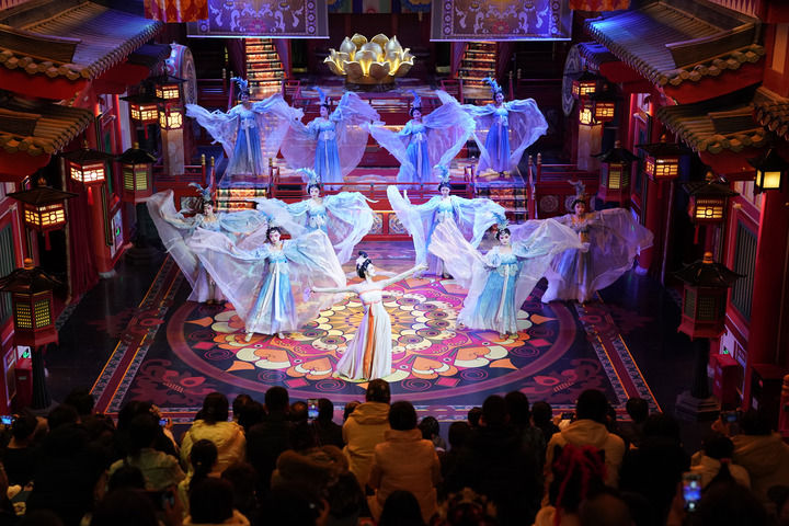 2025年12月23日,演员在西安长安十二时辰主题街区内表演大唐乐舞《霓裳羽衣舞》。新华社记者 邵瑞 摄